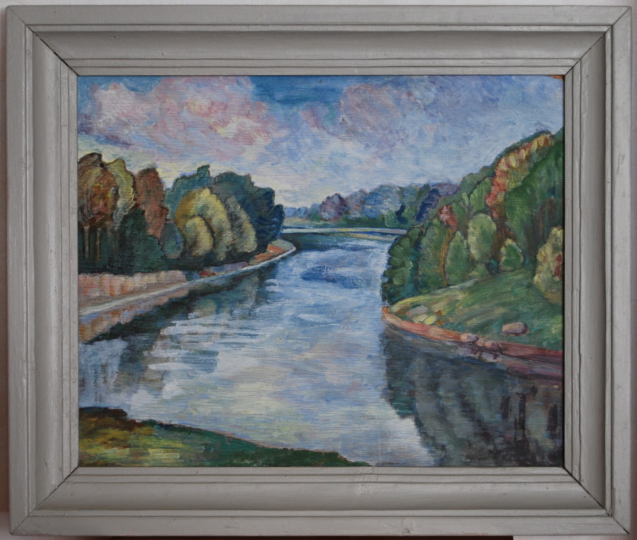 Pärnu jõgi Võiera kooli juures. Vaade Raiesmiku rippsilla lähedalt koolimaja poole. Õlimaal.